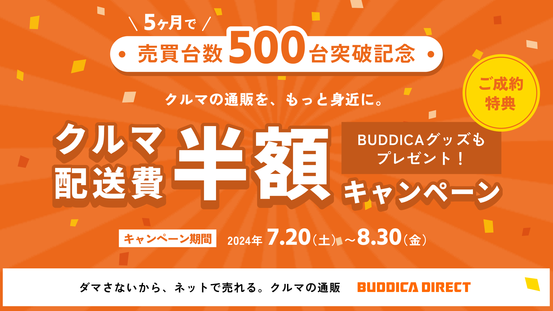 WebやLINEのやり取りだけで中古車販売を全国規模で展開するバディカダイレクト株式会社 (URL: https://buddica.direct /本社:東京都渋谷区 / 代表取締役社長:中野 優作)は、累計売買台数500台を突破を記念し、7月20日~8月30日までの1か月間、クルマご購入の際の配送料金半額キャンペーンを実施いたします。